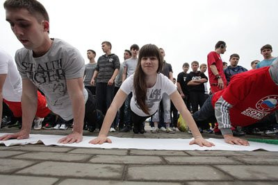 Около 300 амурчан приняли сегодня участие в спортивно-патриотической акции «Рекорд Победы». И стар и млад отжимались от тротуарной плитки на центральной площади Благовещенска. Итогом акции стала цифра 24 837.