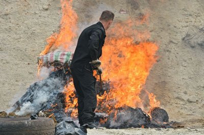 Мешки с вещественными доказательствами сложили внушительной кучей и подожгли. Как отметили сотрудники амурского УФСКН, им сегодня повезло с погодой — специалисты опасались дождей, которые могли помещать операции. Не стал препятствием даже сильный ветер. «Главное, в это время не становиться по ветру, потому что дым от костра очень тяжелый», — отмечают полицейские. После того как костер догорает, кострище разравнивают — от наркотиков должен остаться только мельчайший пепел.