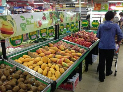 Соки в продаже есть, однако это соки содержанием не более 20 процентов, как напитки. Настоящих соков в этом магазине не было, а может я до них не дошел. Зато порадовали молочные продукты. Несмотря на иероглифы, почти все было понятно и среди творогов, и среди йогуртов. Кстати, тут два вида молока: из сои — традиционное, и настоящее — его китайцы пьют все больше и больше.