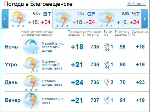 В Благовещенске прогнозируется переменная облачность, кратковременные дожди. Ветер южный 5-10 м/сек. Температура ночью +19+21 гр., днем +26+28 гр.
