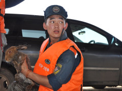 Спасатели в Хабаровском крае помогли зайцу, повредившему во время паводка лапку. Животное пыталось забраться на забор, чтобы спастись от воды, но из-за травмы не могло это сделать.