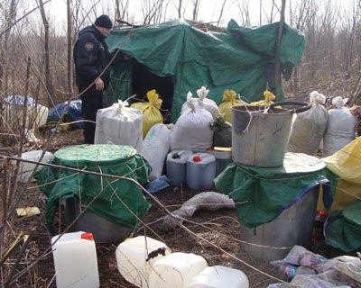 Информация о мини-заводе по изготовлению наркотиков в амурское управление ФСКН России поступила в начале ноября. Когда она подтвердилась, наркополицейские организовали круглосуточное оперативное наблюдение. Мини-завод — шалаш, где в качестве подстилки дельцы использовали отработанную марихуану, — сельчане организовали на заболоченном участке местности. От ближайшей деревни он располагался в 30-40 километрах, от трассы — в 300-500 метрах. Машину, на которой наркодельцы добирались до места, они оставляли на дороге, далее шли пешком. На своеобразном заводе был свет, электричество вырабатывал генератор, установленный неподалеку. Использовались центрифуга и газовые плитки. В шалаше, мешках, тазах находилось большое количество марихуаны, в 200-литровом баке была замочена конопля.