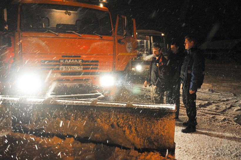 На магистральные и поперченные им улицы вышли два звена по пять подметально-уборочных машин. Одно звено с четырьмя машинами убирало дороги в микрорайоне, КПП и на мосту через Зею.