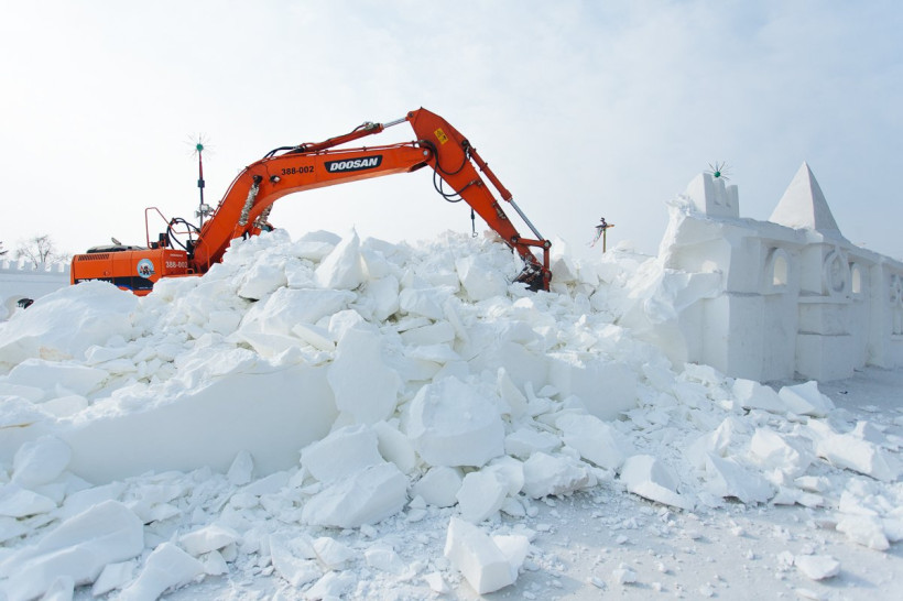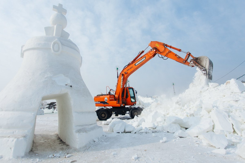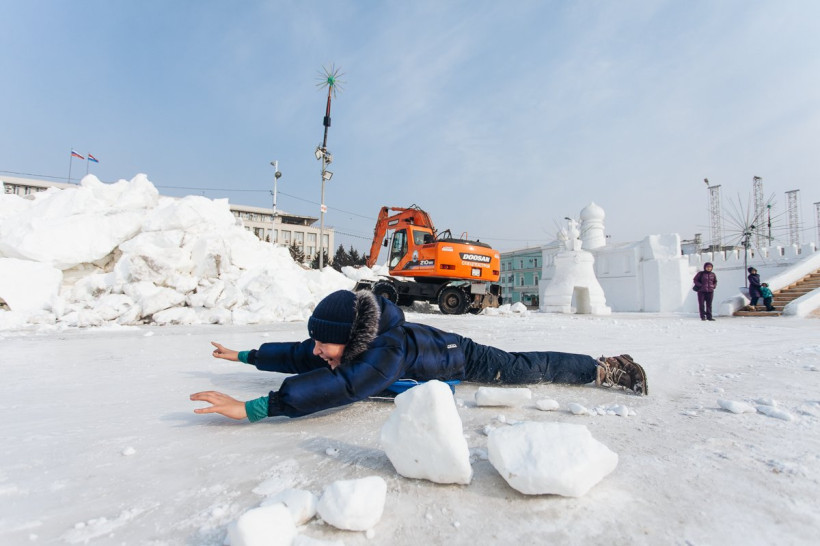 На площади Ленина в амурской столице начали частично демонтировать снежный городок. Из-за тепла некоторые конструкции — башни, одна из горок, части снежной стены вдоль центральной улицы — подтаяли и покосились.