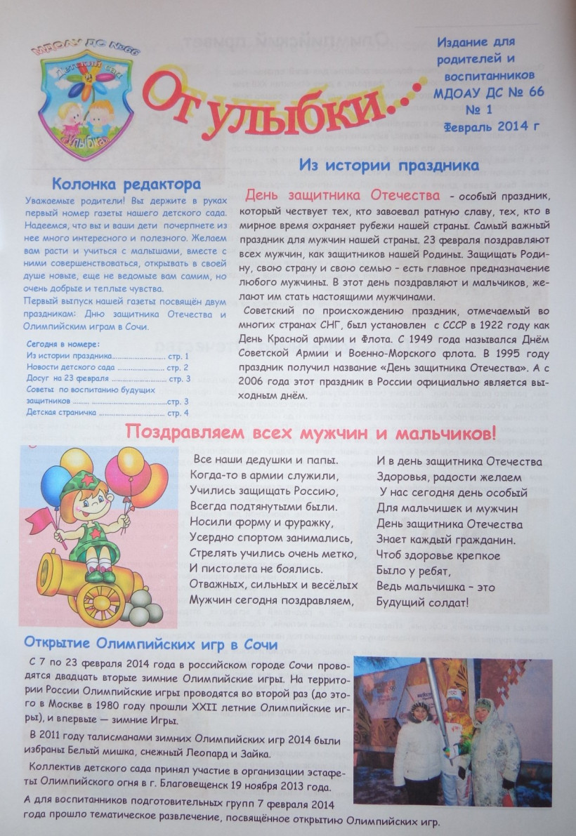Благовещенский детский сад № 66 начал издавать внутреннюю газету, ориентированную как на родителей, так и на малышей. В этом месяце вышел первый выпуск печатного издания. В нем опубликовали новости о проведенных в детском саду праздниках, городских мероприятиях, напечатали консультационный материал для родителей. Есть в газете и детская страничка.