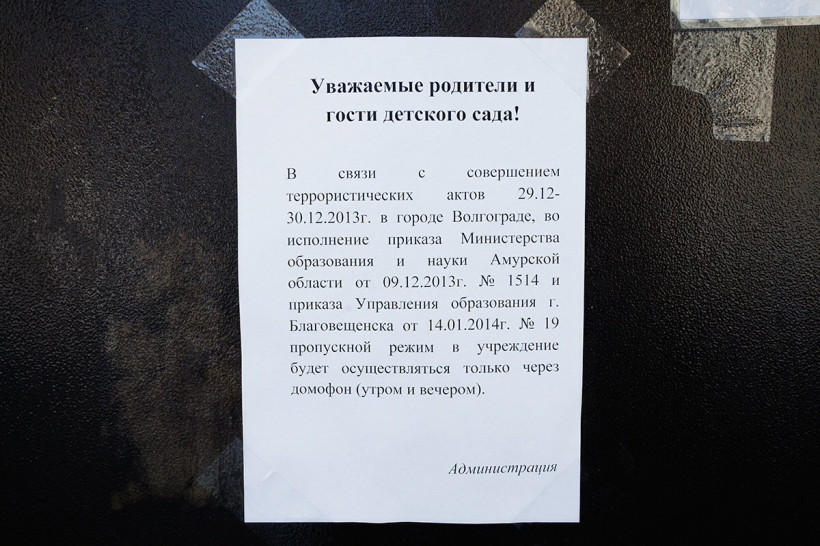 Попытка попасть в первый, выбранный наугад, с треском провалилась. Хотя калитка была не заперта, входная дверь оказалась наглухо закрыта. А через домофон, после того как я представилась, сообщили: «Извините, пройти вы не сможете». Еще более красноречиво информация донесена в объявлении на двери: в связи с террористическими актами в Волгограде в учреждении образования введен пропускной режим.