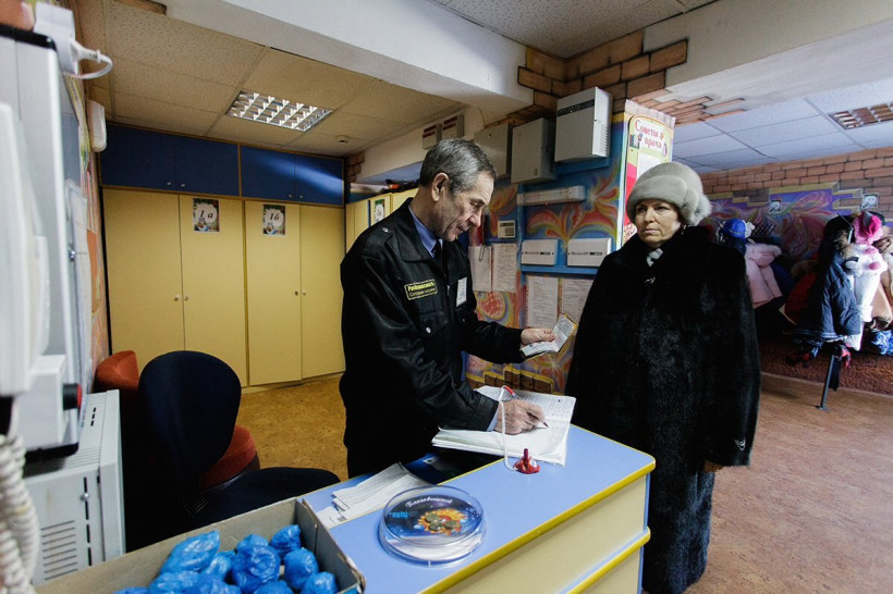 В прогимназию на Горького мы прошли, нажав кнопку и вызова и сообщив цель визита. Однако дальше поста охранника пройти не удалось. Он достает журнал и требует наши документы: каждый входящий проходит регистрацию в журнале посетителей. Также на столе есть списки учащихся и воспитанников: охранник сверяется с ним, пропуская утром детей. Даже родители не могут войти в группу просто так: при необходимости охрана связывается с воспитателем по прямой связи.