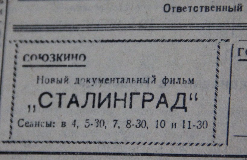 На днях в крупных кинотеатрах Москвы началось демонстрирование фильма «Сталинград», производства центральной студии кинохроники. За первый день картину успели посмотреть до 55 тысяч человек. Московская контора кинопроката получила сотни заявок на этот фильм от клубов и домов культуры. На копировальных фабриках печатается 300 копий «Сталинграда», которыми будут обслужены фронтовые части и освобожденные районы. В Приамурье демонстрация нового документального фильма начнется в середине апреля.