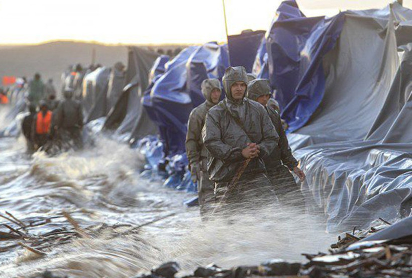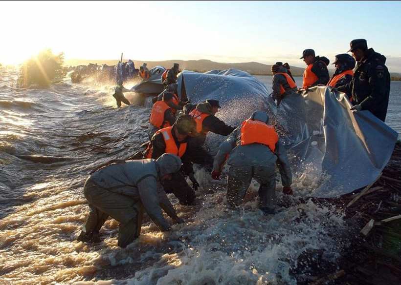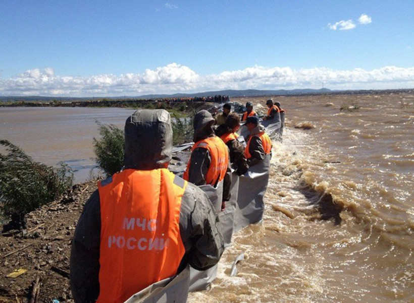 В некоторых местах Мылкинская дамба была очень узкой, проехать на машине по ней было невозможно. Поэтому противостоять стихии пришлось людям: 50‑килограммовые мешки с песком, предназначенные для укрепления защитного сооружения, передавали из рук в руки. Для сдерживания натиска воды использовали и специальные гидроналивные дамбы, представляющие собой широкие резиновые полосы. Солдаты, сотрудники полиции и МЧС, постоянно меняясь, круглосуточно стояли по пояс в холодной амурской воде и держали своими руками защитное сооружение, чтобы его не смыло.