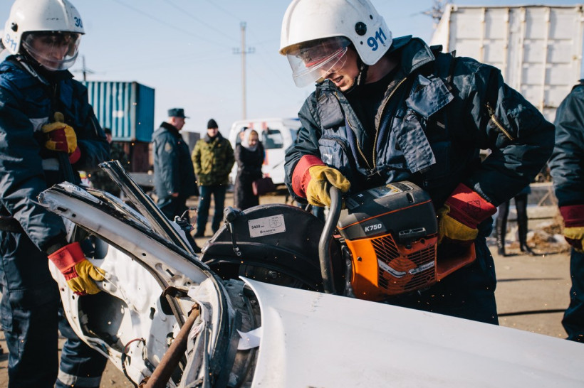— Выставили знаки ограждения, огнетушитель, провели разведку зоны работ, оценили степень тяжести пострадавших, оказали первую помощь, закрепили автомобили, отключили аккумуляторы машин, чтобы не сработали подушки безопасности, —комментирует происходящее начальник поисково-спасательного отряда амурского центра гражданской защиты и пожарной безопасности Борис Чугунов. Он руководит тренировкой, периодически отдает команды по рации и принимает промежуточный отчет.