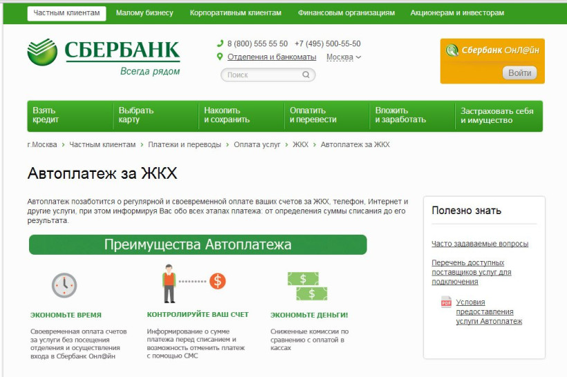 Подробную информацию о подключении услуг и перечне организаций, в пользу которых могут совершаться платежи в рамках услуги «Автоплатеж» можно получить в отделении Сбербанка, на сайте банка и по тел. 8 800 555 55 50.