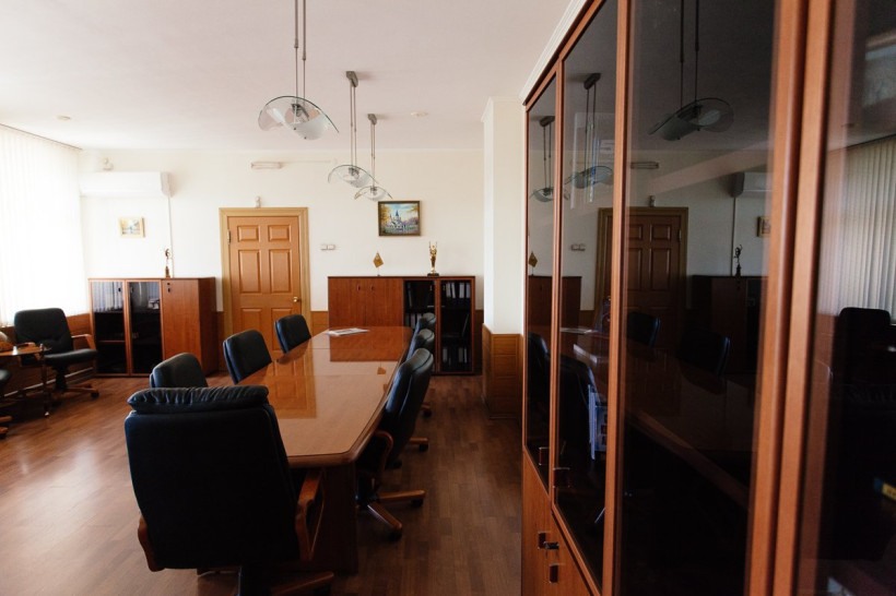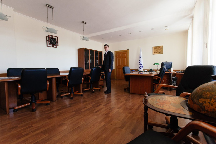 В стильном, но скромном по банковским меркам кабинете ничего вычурного: рабочий стол, стол для переговоров, несколько шкафов с книгами и сувенирами.