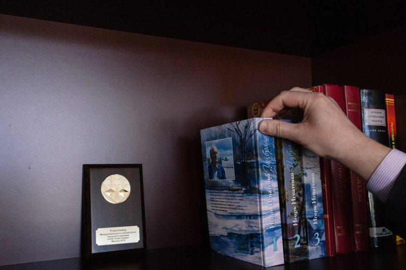 В книжном шкафу несколько десятков книг. Среди них — трехтомник произведений амурского поэта Игоря Игнатенко.