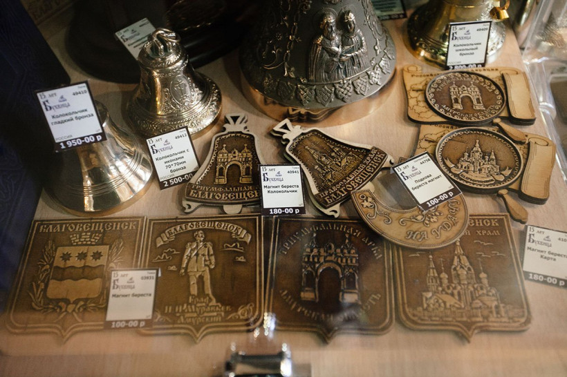 Китайские производители тоже не отстают и предлагают амурчанам популярный и недорогой сувенир по ценам, чуть ниже российских компаний. Так, в одном из торговых центров продавцы из Поднебесной продают магниты с нашей символикой по 30 рублей.
