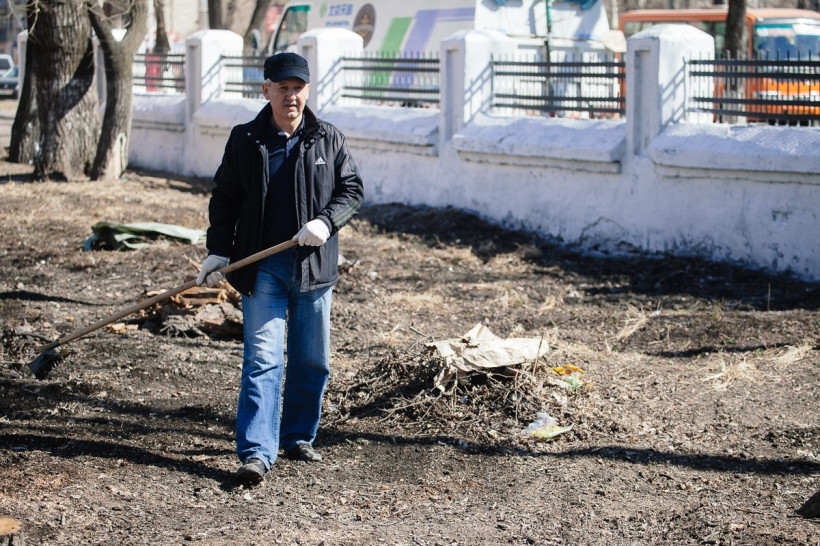 Александр Козлов взялся за грабли в благовещенском сквере