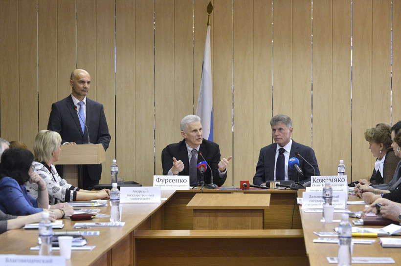 Прибывший в Приамурье помощник президента РФ Андрей Фурсенко сегодня, 14 апреля, провел в АмГУ встречу с ректорами, преподавателями и студенческим активом пяти амурских вузов. «Хочу напомнить, что я не министр образования уже два года, и денег с собой не привез, поэтому наш разговор носит общий стратегический характер», — с этой фразы Андрей Фурсенко начал общение с собравшимися. В этой встрече также принял участие губернатор Амурской области Олег Кожемяко.