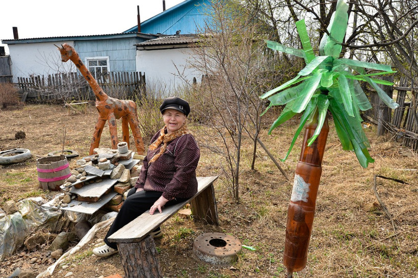 — В прошлом году у нас в деревне конкурс проходил на украшение дворов. Мы с детьми тоже постарались. А вот наш Степушка, — хозяйка с улыбкой показывает на пятнистого рогатого жирафа. — Мы его с моими внучками Галей и Олей сделали из старых тряпок, палок, цемента. И старший внук Женя нам еще помогал — он уже студент ДальГАУ, без него трудно было бы соорудить такого африканца-великана.