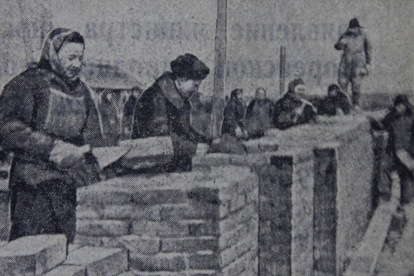 В совхозе Дальневосточный сооружается мощная электростанция. Строительство ее должно быть закончено в этом году. Она обеспечит электроэнергией мастерские, механизированный зерновой двор, животноводческие постройки, а также квартиры рабочих и служащих совхоза. На фото, на переднем плане, — Мария Печка. В короткий срок она овладела специальностью каменщика и сейчас ежедневно выполняет сменные нормы.