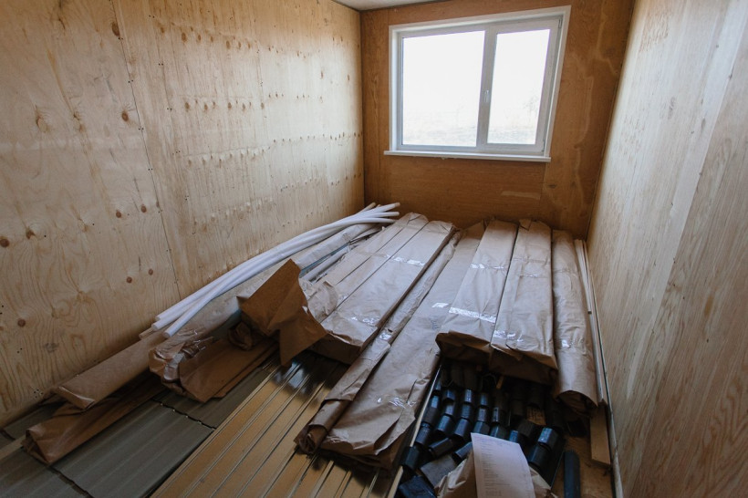 Монтажом занимается еще одна хабаровская фирма. Строители крепят основу для дома на сваи, и в эту коробку устанавливается «вагончик». При ближайшем рассмотрении оказывается, что это полноценный дом. Внутри — комнаты, двери, окна. В самом маленьком из домов есть котельная, санузел, кухня и комната. Дом укомплектован полностью: оборудованием для топочной, линолеумом, покрытием для крыши и даже отделкой межкомнатных дверей.
