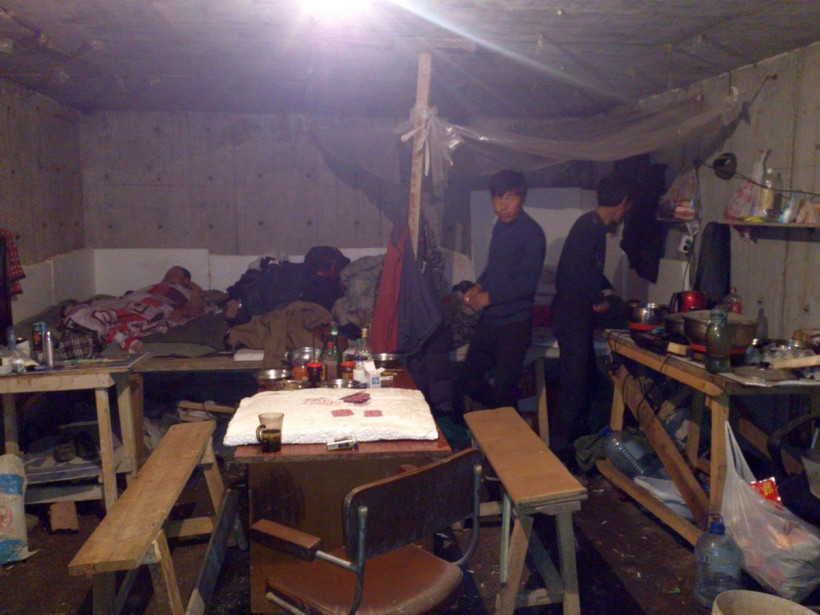 Китайские рабочие спали в ряд на высоком настиле из досок, у стены оборудовали кухню, пищу готовили на электроплитках, в центре стояли стол и стулья.