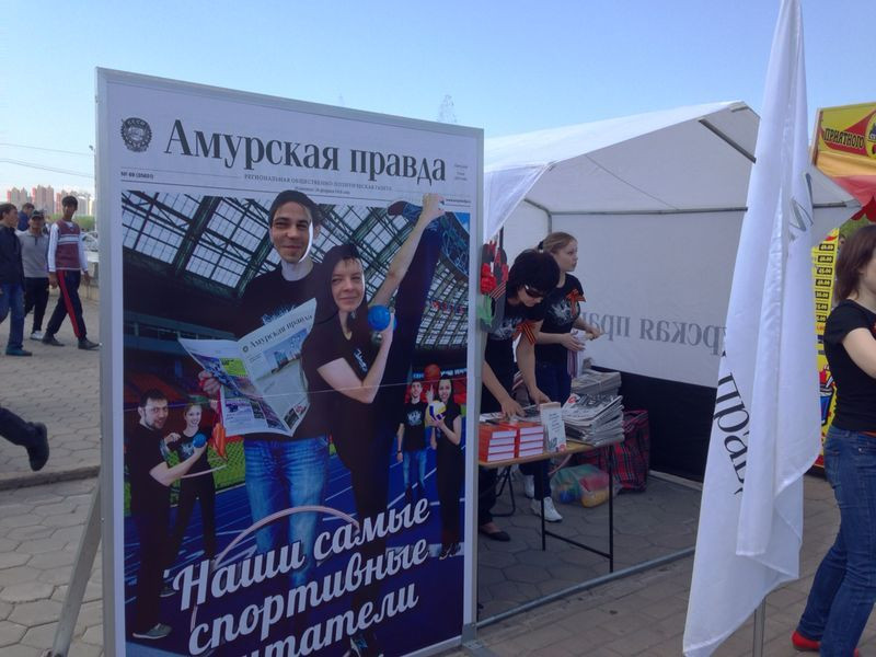 У фонтана на центральной площади амурской столицы открылась традиционная палатка АП. Здесь можно пообщаться с журналистами, сфотографироваться в образе спортсменов, поучаствовать в конкурсах и получить призы.