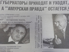 «Губернаторы приходят и уходят, а «Амурская правда» остается» — с таким заголовком вышла в свет областная газета 25 мая 1996 года. К рекламе подписной кампании газета привлекла экс-губернаторов области. «АП интересная газета, но надо же и поспорить с вами!» — заявляет Альберт Кривченко. «АП отражает события так, как они происходят на самом деле», — предлагает свой слоган Александр Сурат. Владимир Полеванов называет АП самой профессиональной газетой области, а Владимир Дьяченко — самой читаемой. «Не все они любили, но все читали нашу газету. А вы остаетесь с нами?» — теперь уже обращается к потенциальным подписчикам газета.