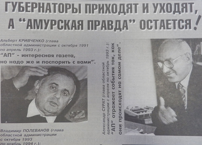 «Губернаторы приходят и уходят, а «Амурская правда» остается» — с таким заголовком вышла в свет областная газета 25 мая 1996 года. К рекламе подписной кампании газета привлекла экс-губернаторов области. «АП интересная газета, но надо же и поспорить с вами!» — заявляет Альберт Кривченко. «АП отражает события так, как они происходят на самом деле», — предлагает свой слоган Александр Сурат. Владимир Полеванов называет АП самой профессиональной газетой области, а Владимир Дьяченко — самой читаемой. «Не все они любили, но все читали нашу газету. А вы остаетесь с нами?» — теперь уже обращается к потенциальным подписчикам газета.