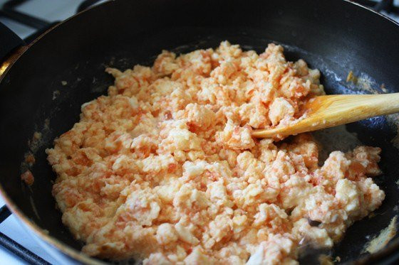 Разбейте 2 яйца в миску и взболтайте их вилкой. Разрежьте помидор пополам и потрите на терке в миску с яйцами. Немного посолите и перемешайте. На разогретую сковородку вылейте немного подсолнечного масла и получившуюся яично-помидорную смесь. Теперь главное — не дать помидору и яйцам превратиться в цельный кусок. Для этого помешивайте смесь лопаткой. В итоге должна получиться россыпь пористых комков. Когда большая часть воды испарится со сковородки, выкладывайте готовый омлет на тарелку. Можно добавить в готовое блюдо свежей зелени.