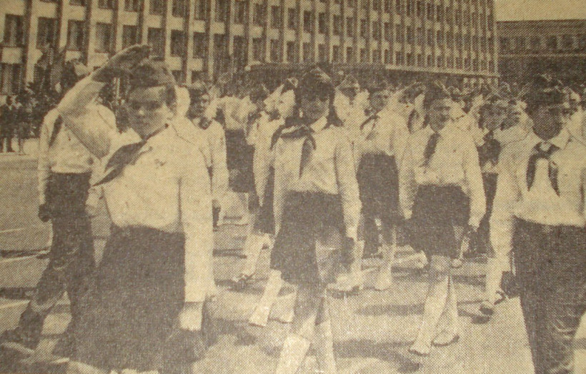«День удался на славу. Безбрежное голубое небо над головой. И солнце, по-летнему яркое, щедрое, — пишет газета в 1974 году. — Ветер с Амура развевает кумачовые флаги на празднично украшенной главной площади Благовещенска, носящей имя великого Ленина. С утра собрались на ней сотни мальчишек и девчонок в парадной пионерской форме. Командующий парадом, благовещенский школьник Женя Соколов, рапортует о том, что участники областного пионерского слета «Дорогой Ленина идти всегда готовы!» построены для участия в параде».