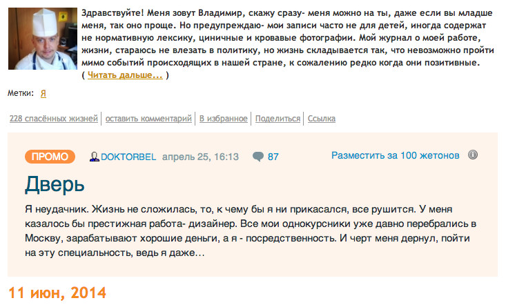 — Здравствуйте! Мне 36 лет, работаю врачом анестезиологом-реаниматологом. Есть семья, дети. В ЖЖ оказался по весьма житейской причине — хотел заработать. Дело было в 2010 году. Нашел ролик о заработке в соцсетях, посмотрел его, попробовал. Скажу сразу — особых денег мне это занятие не принесло, поэтому блог я скоро забросил, но вскоре почувствовал желание вести его уже для себя. Со временем вернулся, мне стало просто интересно.