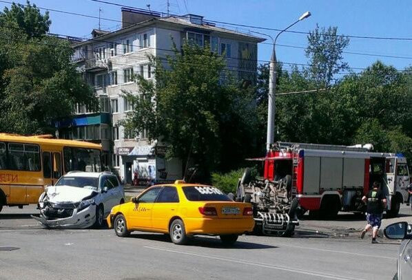 При столкновении автомобилей «Нива» и «Тойота» машина российского автопрома опрокинулась на крышу. Находящиеся в ней пассажиры серьезно пострадали. Одного из них в бессознательном состоянии (предположительно комы) на скорой помощи увезли в дежурную больницу. Во время столкновения, как сообщают очевидцы, был задет автомобиль такси.