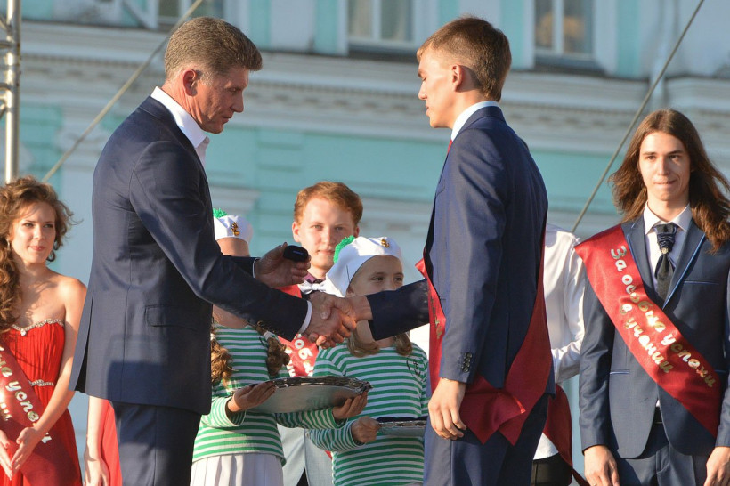 На площади Ленина их поздравили власти, учителя и творческие коллективыБолее тысячи выпускников благовещенских школ и их родители собрались сегодня на площади Ленина. Обладателем аттестата с отличием стал 51 вчерашний школьник, а 40 получили региональные медали «За особые успехи в учении» из рук губернатора области Олега Кожемяко. Награды лучшим ученикам также вручил и. о. главы городской администрации Александр Козлов. В этом году четверо благовещенцев показали максимальный результат по ЕГЭ — сто баллов, всего 6 не получили аттестаты из-за не сдачи ЕГЭ. Выпускной бал по традиции стал настоящим городским праздником. Задавали модный тон празднику нарядные школьницы. Яркие платья и счастливые лица запечатлел фотокорреспондент АП Андрей Оглезнев.