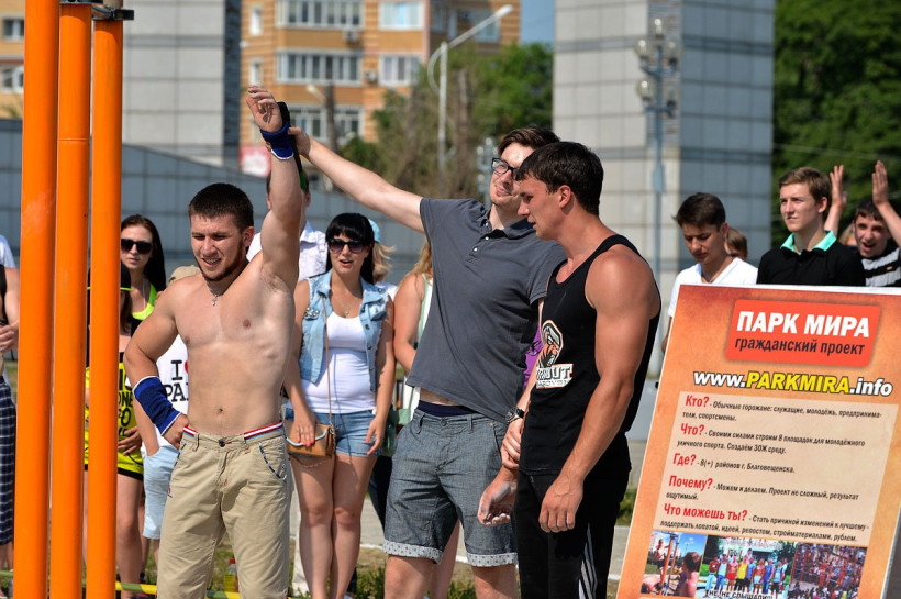 В областном центре впервые прошло первенство России по стрит-воркаутуВ рамках празднования Дня молодежи в амурской столице впервые прошло первенство России по стрит-воркауту. На площадке возле Общественно культурного центра в течение трех часов длилась «Воркаут-битва» (Workout battle), в которой состязались команды Благовещенска и Хабаровска. В программе: парные батлы, силовое многоборье, силовые конкурсы со зрителями, показательные выступление воркаут-спортсменов. В командном зачете сборная Благовещенска заняла первое место. Призовые места также были разыграны и в личном первенстве. За демонстрацией трюков на гимнастических снарядах наблюдал фотокорреспондент АП Андрей Оглезнев.