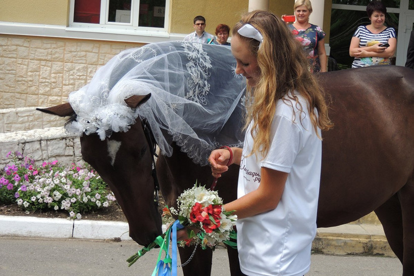 — Женить лошадей — почти то же самое, что и людей. Сначала мы с ними встретились, познакомились, они меня обнюхали, — вспоминает ведущая праздника Елена Грисько. — Это замечательные животные, у них трогательная история любви, и они достойны такого красивого бракосочетания.