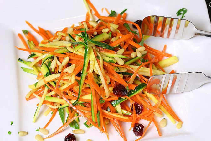 Цукини — 2 шт., морковь молодая — 1 шт., лук красный — 1 шт., лимон — 1 шт., чеснок — 2 зубчика, кинза — маленький пучок, цветочный мед — 2 ст. л., перец, соль.