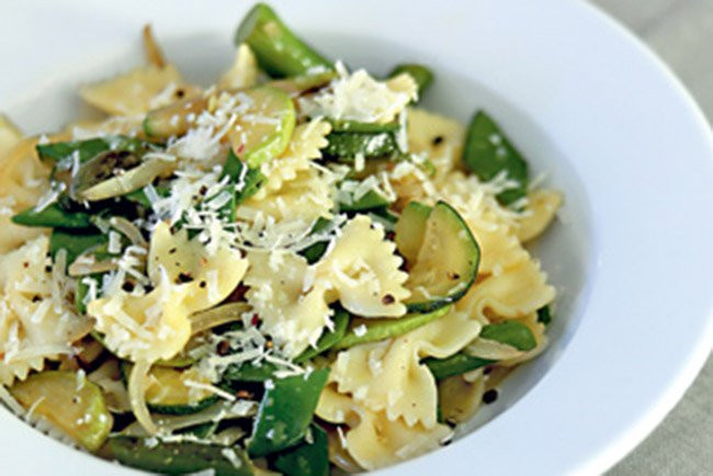 Паста фарфалле (бантики) — 300 г, цукини — 1 шт., кабачок — 1 шт., стручки молодого горошка — 150 г, стебли зеленой спаржи — 8—10 шт., луковица — 1 шт., чеснок — 2 зубчика, пармезан — 30—50 г, оливковое масло, соль, молотый черный перец.