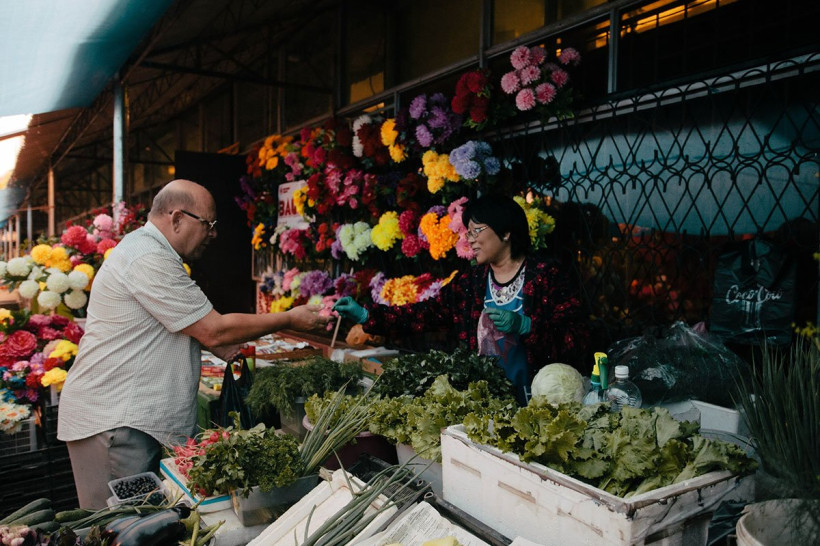 По соседству ее «огуречный» конкурент Виктор зазывает покупателей семейным рецептом засолки огурцов.