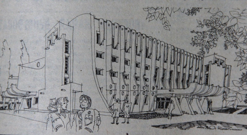 «В институте Амургражданпроект закончена корректировка проекта плавательного бассейна, — сообщает АП 18 июля 1987 года. — Того самого, который несколько лет назад начал строиться на перекрестке улиц Ленина и Артиллерийской. Объект длительное время находился на консервации, так как изменились технические требования к такого рода сооружениям. Что представляет собой второй плавательный бассейн в нашем городе? Просторный вестибюль объединяет зал с 50-метровой ванной и вышкой для прыжков. Спортивные соревнования смогут одновременно наблюдать 650 зрителей. Предусмотрены залы для обучения плаванию малышей. В комплексе бассейна — школа спортивного мастерства. Для этого запланированы залы бокса, борьбы. Перед фасадом задуман сквер. У бассейна — крупная силуэтная форма, вызывающая ассоциацию с водной стихией — волной. Цветовое решение — сине-зеленый цвет, более насыщенный кверху, который будет перемежаться мощными белыми вертикалями лестничных клеток и солнцезащитными ребрами».