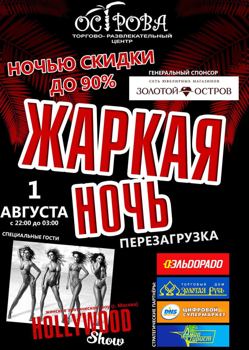 «Острова» встретят август «Жаркой ночью». С 22:00 1 августа до 3:00 второго августа у благовещенцев будет возможность получить различные бонусы и скидки до 90 % во всех отделах торгово-развлекательного центра.