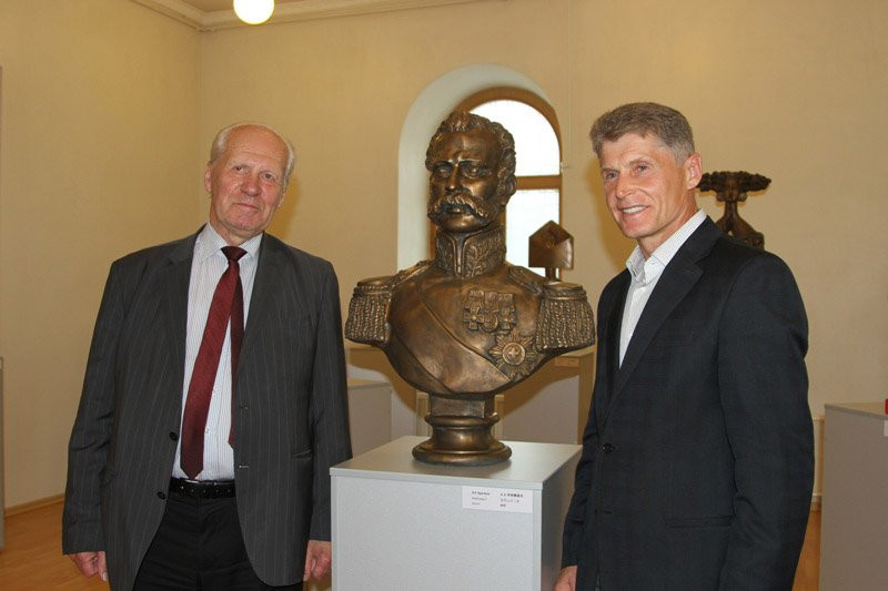 Скульптор с мировым именем Александр Бурганов передал амурчанам бронзовый бюст Александра II. Губернатор Олег Кожемяко от имени амурчан поблагодарил скульптора за подарок.