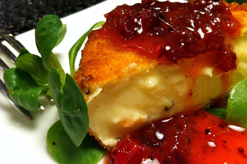Положить абрикосы в стеклянную посуду, залить водой, поставить в микроволновую печь и довести до кипения. Слегка остудить и измельчить до образования пюре. Добавить по вкусу бальзамический уксус. Четыре ломтика сыра обвалять в панировочных сухарях, обжарить в масле, пока они не приобретут золотисто-коричневый цвет, и полить соусом. Подавать такое блюдо можно с жареным картофелем, помидорами и шпинатом.