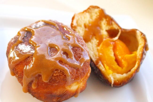 Половинки консервированных абрикосов полить водкой, добавить гвоздику и оставить на 3 часа, время от времени перемешивая. Яйца взбить с сахаром, добавить муку и ванилин, размешать до получения однородного теста. Разогреть масло. Обмакивать половинки абрикосов в тесто и обжаривать в горячем масле до золотистого цвета. Выложить на бумажное полотенце. Перед подачей на стол посыпать пончики сахарной пудрой.