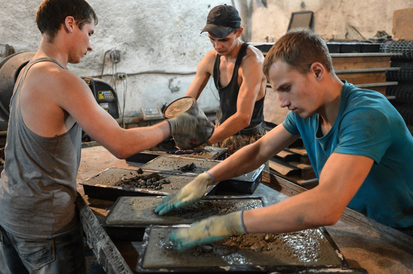 В просторном гараже кипит работа. Кашеобразная серая бетонная масса, как пирог, закладывается в формы. Они становятся похожими на пористый шоколад.