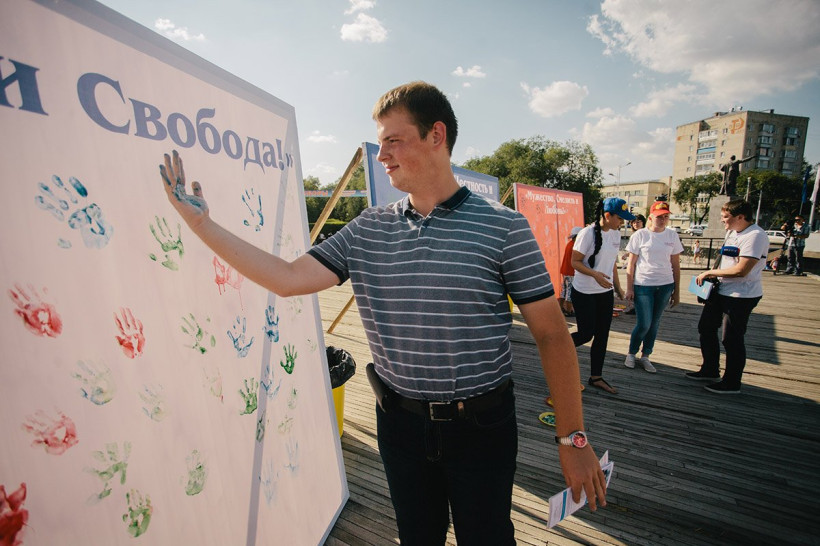 Благовещенцы оставили отпечатки ладоней на баннерах трех цветов