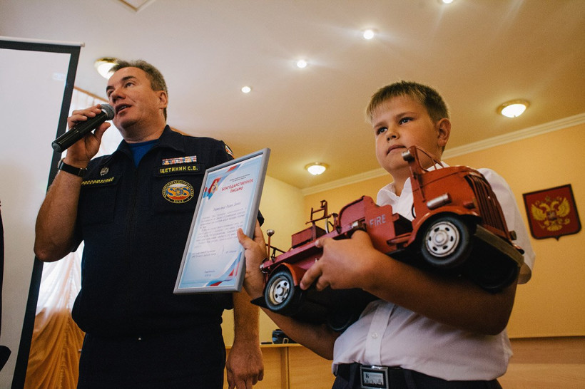 Помимо медали, Вадиму спасатели вручили помощника в учебе — ноутбук. А на память о встрече — огромную модель пожарной машины и, конечно же, фото с заслуженным спасателем России. Впрочем, поделился с прессой школьник, будущее свое он видит не в структуре МЧС, а в спорте — хочет стать финансовым директором амурской футбольной команды. Первый шаг в карьере уже сделан — записался в секцию футбола.