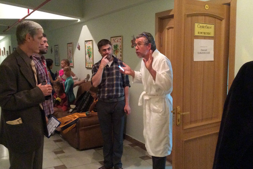 Московские артисты снимают художественное кино про вредного артиста Заяблонского«Слушай, а давай штанами поменяемся: я же баянист, мне нужны приличные брюки», — с этими словами режиссер Николай Бурлак перелазит из своих рабочих бриджей в строгие брюки помощника президента фестиваля «Амурская осень» Алексея Говорова. Несколько вспышек смеха — и рабочая обстановка снова налаживается. Камера, мотор, начали! Пока одни артисты разыгрывают перед зрителями спектакли и представляют свои фильмы, в области вовсю идет съемка короткометражной художественной картины — житейской истории вредного и избалованного вниманием публики актера, который попал на фестиваль «Амурская осень». Корреспондент АП побывал на пятом дне съемки фильма и поучаствовал в массовке.