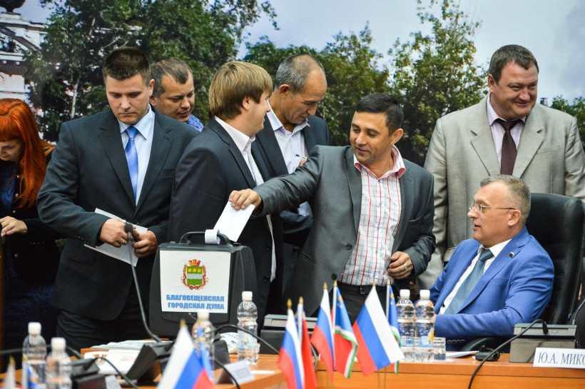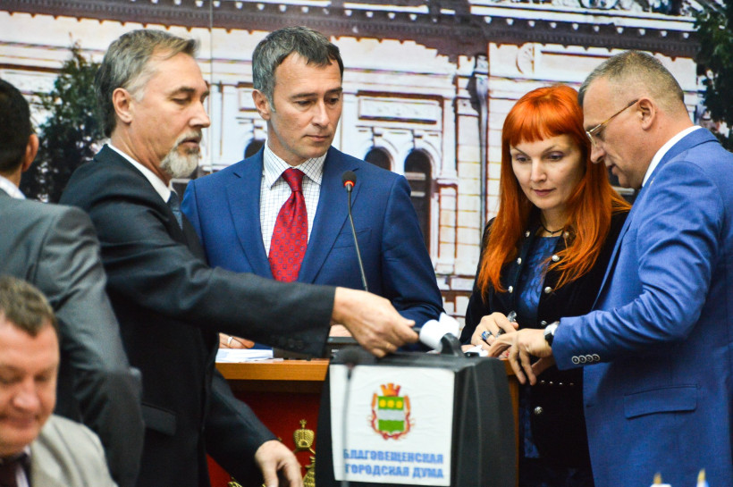 Сегодня, 18 сентября, народные избранники нового, шестого, созыва гордумы собрались на первое заседание. Перед этим глава городского избиркома Юрий Миков вручил им мандаты, а также памятные медали с изображением генерал-губернатора Николая Муравьева-Амурского, которому была посвящена прошедшая избирательная кампания.