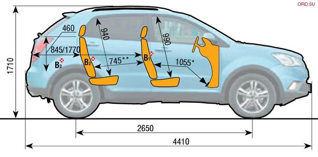 Вместительный салон позволяет комфортно разместиться пятерым взрослым людям. SsangYong Actyon обладает одним из самых больших в классе среднеразмерных внедорожников багажником — 486 литров. Спинка заднего сиденья складывается в пропорции 60:40, что позволяет увеличить объем багажника до 1312 литров.