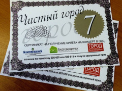 Участники «Чистого города» в амурской столице смогут бесплатно получить билет на любой из концертов в Общественно-культурном центре (ОКЦ). Сегодня, 30 сентября, в мусорные мешки, которые муниципальное предприятие «Городской сервисно-торговый комплекс» выдает в рамках общегородского субботника, положили 15 сертификатов на билет от ОКЦ.