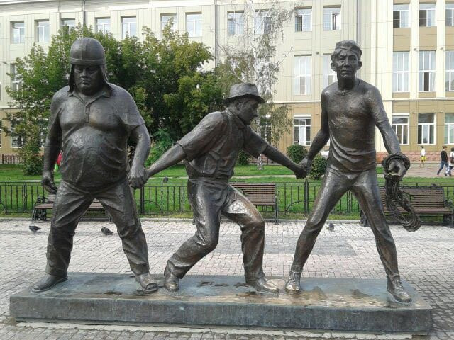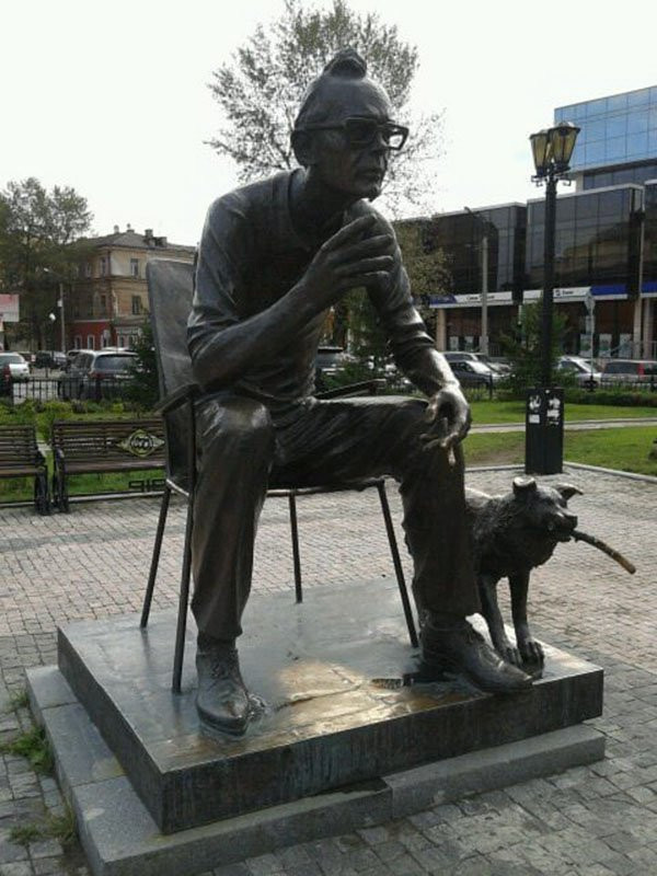Шагая по «зеленой линии» дальше, мы выйдем на площадь Труда, где у здания цирка в декабре 2012 года был открыт памятник Леониду Гайдаю. С сигаретой в руке он сидит на режиссерском стульчике. Напротив него Трус, Балбес и Бывалый в «Кавказской пленнице», взявшись за руки, останавливают автомобиль. Внутри композиции возникает ощущение, будто попал на съемочную площадку. Достоверность столь велика, что на открытии памятника Ирина Мирошниченко сказала, что ей захотелось подойти прикурить к режиссеру. Амурчане помнят, что Гайдай родился 30 января 1923 года в Свободном. Детство же будущего режиссера прошло в Иркутске, откуда после окончания школы он ушел на фронт. А с 1947 года, после окончания театральной школы, служил в драматическом театре, вплоть до отъезда на учебу во ВГИК.